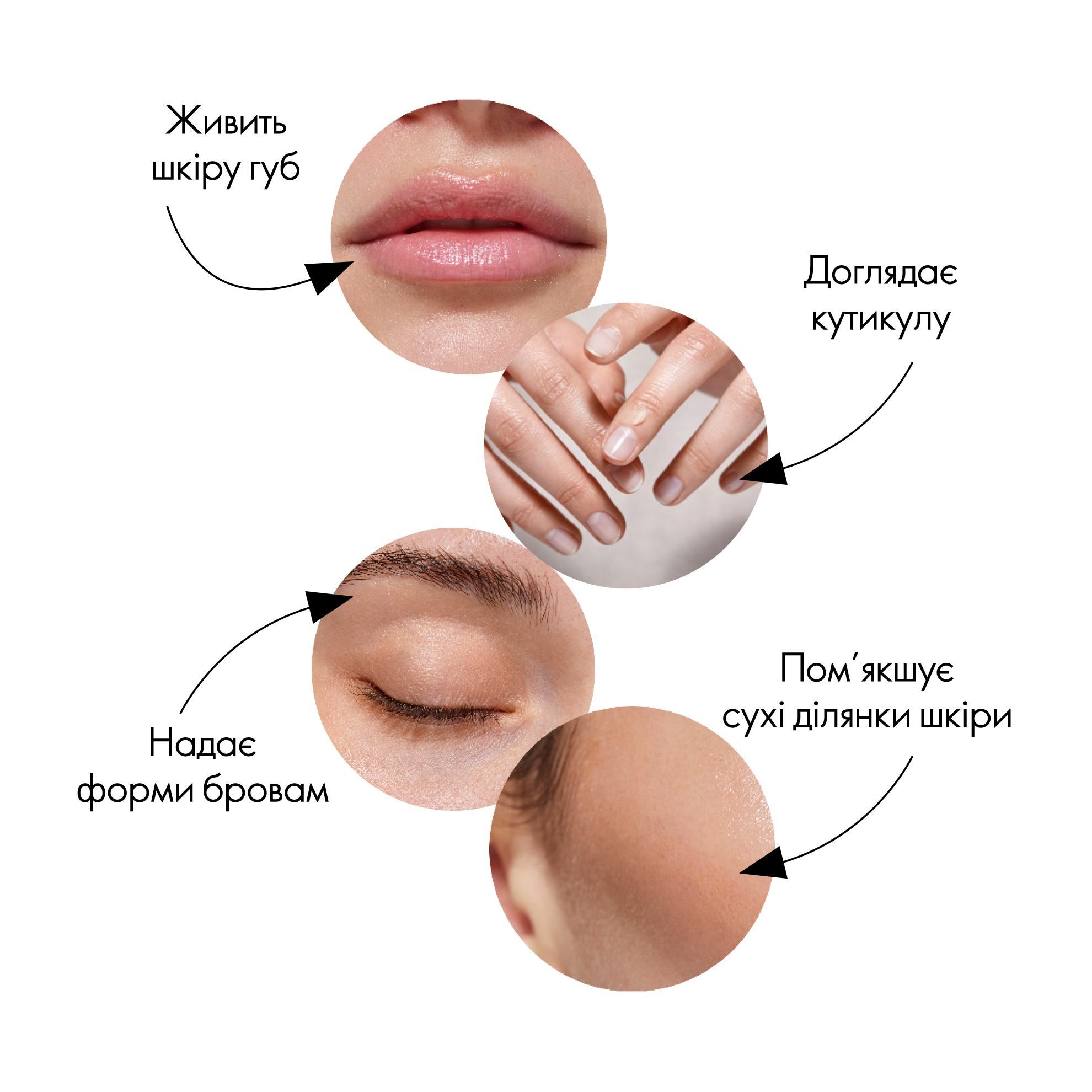 В міру необхідності нанось на губи, брови, кутикули, лікті, ступні та інші сухі ділянки шкіри.